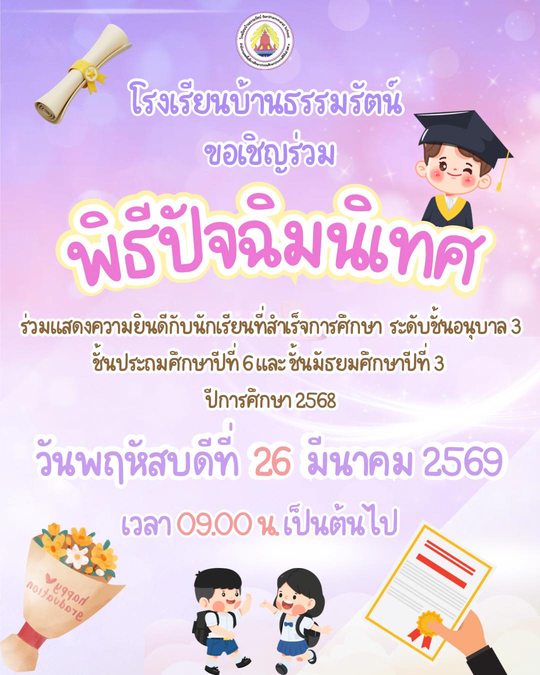 วันอังคารที่ ๒๔ กุมภาพันธ์ ๒๕๖๙ นางสาวนวรัตน์ ดำคำ ผู้อำนวยการโรงเรียนบ้านธรรมรัตน์ มอบหมายให้ นางสาวนิตยา ไชยแก้ว ครูโรงเรียนบ้านธรรมรัตน์ นำนักเรียนระดับชั้นอนุบาลปีที่ ๓ ทำบุญเนื่องในวันพระ ขึ้น ๘ ค่ำ เดือนสี่ (๔) 11 มี.ค. 69